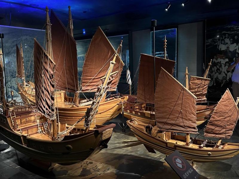 博物馆展示的第一部分:“走向世界”首先展示世界地图。图上圈圈点点的地名,表示华侨从流寓到定居的地点,他们的落地开拓之处。大厅中一艘艘仿制古代帆船模型,也揭示了华侨先祖漂洋过海谋生的辛苦历程,见证了契约华工的悲惨命运。两侧展橱的图片、资料,告诉人们,华侨走向世界的艰苦性和斗争的历程。第二部分:“创业海外”展出的仿制亚答屋和铁皮屋,揭示着华侨先辈投身蛮荒,开发土地,采矿筑路的艰难历程。17世纪-19世纪,不论是东南亚城镇的形成,或横贯美洲大铁路的通车,无不渗透华侨的智慧和血汗。在近代,华侨推广橡胶的种植和加工,使橡胶业一跃成为马来亚的经济支柱,这是华侨历尽艰辛而创下的业绩。在展厅中,还有仿制南洋旧民俗街,它是世界各地唐人街的缩影。在街道上有腊像的人力车夫及人力车实物,主要表示早期华人、华侨创业海外的艰辛历程。还有华侨赠送的旧日常生活用品。及许多烈士照片和纪念碑,向人们诉说无数华侨在居住国历次反侵略、反迫害、争独立的斗争中,在保卫自己人格的尊严中前仆后继、浴血奋战的英雄气概和壮举。