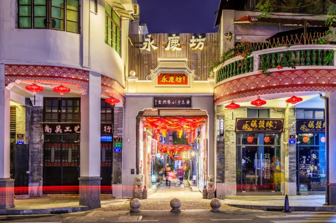 微改造后的永庆坊,以西关风情为特色,融汇人文古建、传统艺术、国际休闲、时尚潮流于一体,成就广州核心历史风情街区,延续着“永颂岁月的喜庆”的美好寓意和祝福。