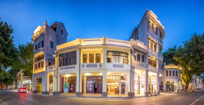 落户永庆坊二期的“网红”书店钟书阁,便是一个潮人集聚之所。钟书阁所在地是一栋民国时期的银行宿舍,改装主要以黑金色为基调,并用玻璃包裹保护原有的红砖外墙,玻璃上涂满中英文,而阁内的装饰融合了广府建筑神韵,以具有岭南特色镬耳墙的内饰装点可供阅读的开放式小隔间,还有精致的吊灯,木质的书格,整个空间既优雅复古又潮流时尚。嗅着书香,品着咖啡,永庆坊的时光在不知不觉间流淌至华灯初上。