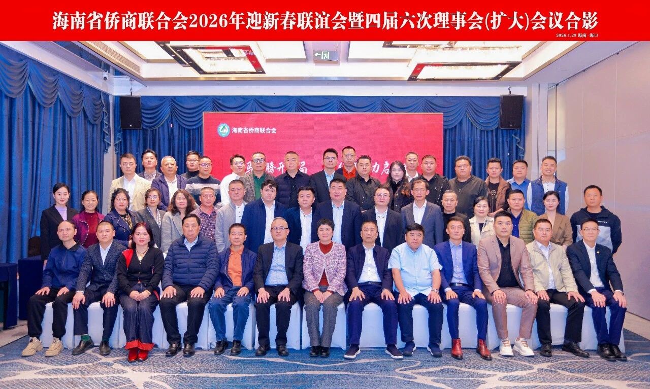1月23日,海南省侨商联合会2026迎新春联谊会暨四届六次理事会(扩大)会议在海口成功召开。海南省侨联党组成员、副主席苏燕,省侨商会会长洪江游、理事长潘家森、监事长何坚,以及第四届理事会成员、各市县侨商会负责人等80余位代表齐聚一堂,共商发展。执行会长赵思远主持会议。