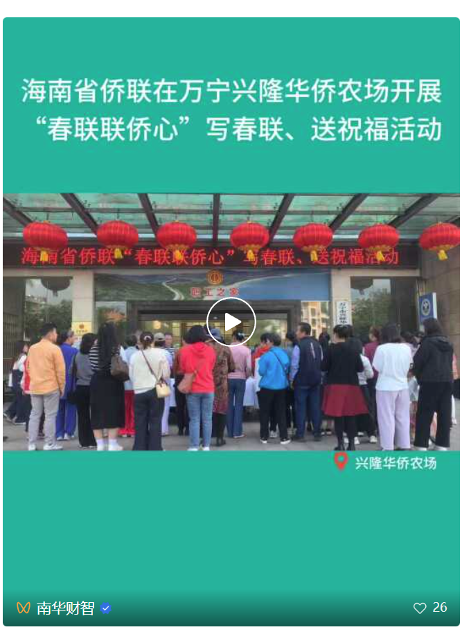 1月28日上午,由海南省归国华侨联合会主办,万宁市侨联、兴隆区管委会及南华时刊杂志社协办的“春联联侨心”活动,在兴隆华侨农场工会“侨胞之家”举行。活动旨在新春佳节来临之际,为侨胞和归侨侨眷送上节日祝福与文化关怀,营造凝侨心、聚侨力的良好氛围。省侨联秘书长、二级巡视员李诚,万宁市侨联主席谢有明,兴隆区管委会副主任陈海文等出席活动。
