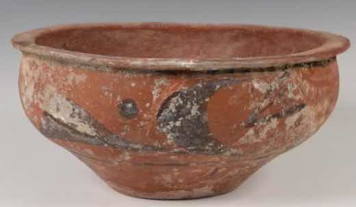 彩陶盆,该藏品产于新石器时代中期(前4000年—前3600年),出土于运城市夏县尉郭乡西阴遗址。该藏品高15厘米、口径35厘米、底径14厘米,泥质红陶,通体磨光。敛口,曲腹,腹部下收,平底。口沿下饰一圈黑色纹带,腹部饰有黑色圆点曲线纹。