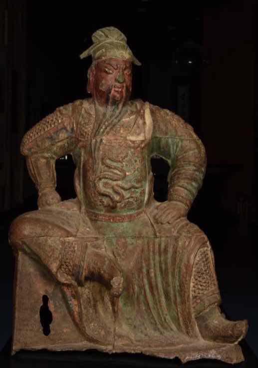 铜首铁身彩绘关公坐像,该藏品产于明代(1368年—1644年),长77厘米、宽52厘米、高116厘米 ,展示了关公戎装坐于长方形座上的情景。