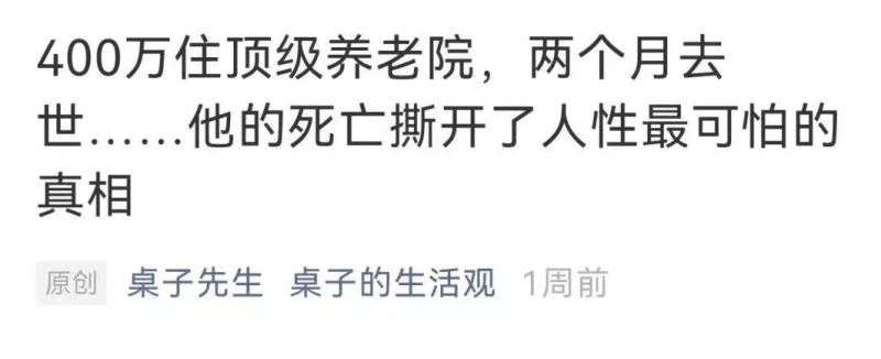 首先,从文章到标题,最吸引眼球的一定是养老院的收费,400万一次性交清,一个月8万。任何人看到这里,都会觉得,如果这样的价格都住不进放心的养老院,那真的是绝望了。