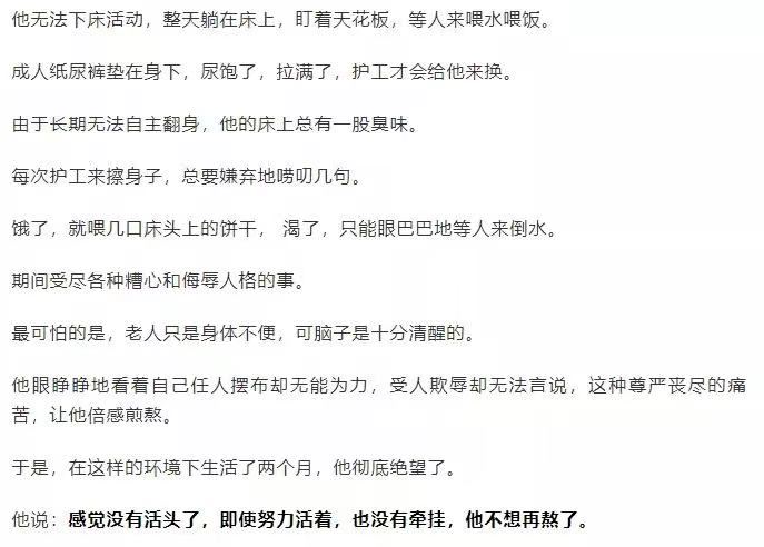结果老人住进去两个月就去世了,原因是养老院里的“秘密”:护工知道老人无儿无女之后,就只给老人吃饼干,老人的尿不湿满了才会换...