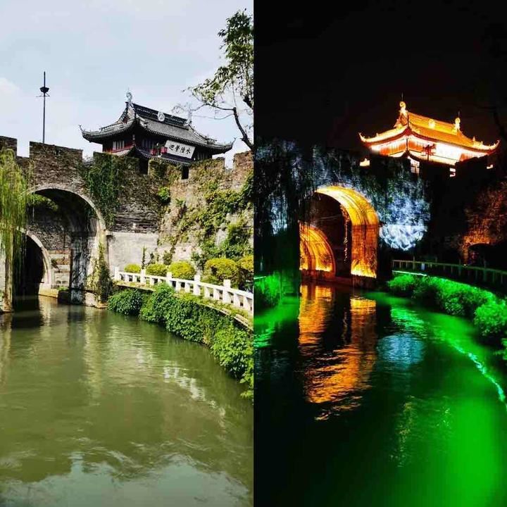 “盘门”水陆城门并峙气势雄伟。陆城门分内外两重,内外两道城垣构成迷长约20米的方形瓮城。古时战守,诱敌至城下,从城上放箭、坠石,宛如“瓮中捉鳖”,全歼入侵之敌人,内城门北面左侧有和条坡度约为20度的城墙跑马道,直抵城墙顶上的一座由巨砖铺铺成的宽阔平台。在此能看到整个陆门、水门、瓮城面区和结构的全貌。为适应古代防御战而设置的锯齿形雉碟、女墙、射孔、闸口、关石、开井(防火用的设置)及眺望台俱在。正在的城楼是1986年重建,飞檐翘角,巍然耸立。城楼前方。架着三尊土炮。重现昔日吴都的风貌。