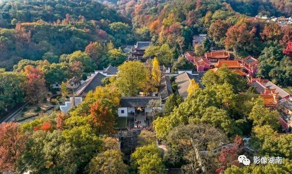 高空俯瞰下岳麓书院山色如翡,层林尽染,晨光给书院的青瓦白墙镀上一层融融暖意。