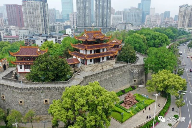 天心阁:天心阁位于长沙市中心地区东南角上,城南路与天心路交会之处的古城墙上,是长沙古城的一座城楼。阁有楼阁三层,建筑面积846平方米,碧瓦飞檐,朱梁画栋。