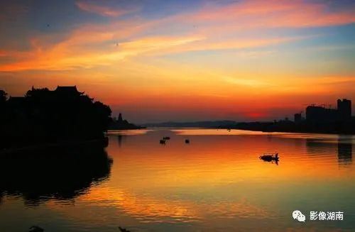 夕阳下的石鼓书院,仿佛一艘大船静静地停泊在湘江边,江水面如镜,几艘渔舟点缀其中。