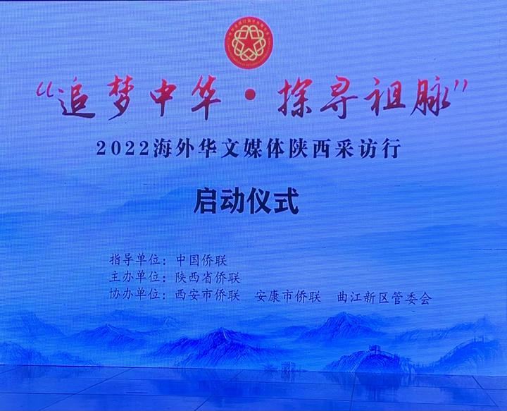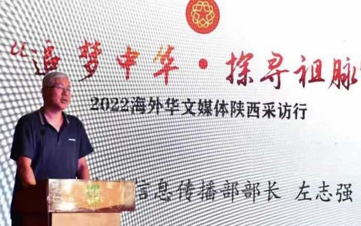 (国际华文媒体联盟记者、马来西亚海内外传媒集团记者、海内外杂志社记者联合报道)8月7日,由中国侨联指导,陕西省侨联主办,西安市侨联、安康市侨联、曲江新区管委会协办的“追梦中华·探寻祖脉”2022海外华文媒体陕西采访行活动启动仪式在西安举办,来自11个国家和地区的14位海外华文媒体代表,以及人民日报、央视总台、光明日报、中新社4家涉侨中央媒体参加了启动仪式, 中国侨联信息传播部部长左志强, 陕西省侨联党组书记程勉贵, 陕西省侨联副主席兼秘书长尚小红, 陕西省侨联副主席、西安市政协港澳台侨和外事委员会主任杨庆, 西安市侨联副主席兼秘书长张天琦等领导也参加了启动仪式, 陕西省侨联党组书记程勉贵首先致辞, 涉侨中央媒体代表中央广播电视总台主任播音员王浩瑜和 海外华文媒体代表加拿大中华新闻社社长常建国先后发言, 中国侨联信息传播部部长左志强在启动仪式上做了讲话。