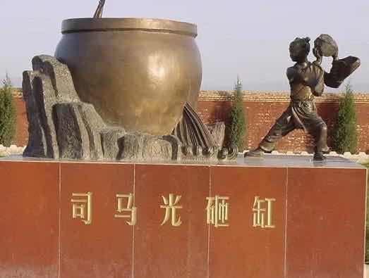 有一次,司马光跟小伙伴们在后院里玩耍。院子里有一口大水缸,有个小孩爬到缸沿上玩,一不小心,掉到水缸里。缸大水深,眼看那孩子快要没顶了。别的孩子们一见出了事,吓得边哭边喊,跑到外面向大人求救。司马光却急中生智,从地上捡起一块大石头,使劲向水缸砸去,“砰”的一声,水缸破了,缸里的水流了出来,被淹在水里的小孩也得救了。小小的司马光遇事沉着冷静,聪明机灵,从小就是一副小大人模样。这件偶然的事件使小司马光出了名,东京和洛阳有人把这件事画成图画,被人们广泛流传。