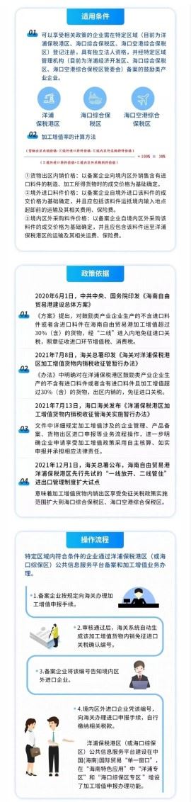 在海关总署等国家部委的大力支持下,加工增值政策率先在洋浦保税港区实施,并扩大至海口2个综保区。
