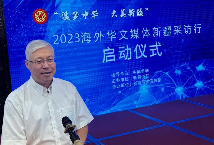 (国际华文媒体联盟记者、马来西亚海内外传媒集团记者、海内外杂志社记者联合报道)6月4日,由中国侨联指导、新疆维吾尔自治区侨联主办、新疆维吾尔自治区党委宣传部协办的“追梦中华·大美新疆”2023海外华文媒体新疆采访行启动仪式在乌鲁木齐举办, 来自马来西亚、美国、加拿大、埃及、德国、法国、瑞典、菲律宾、缅甸、阿根廷、委内瑞拉、印尼、新西兰、尼日利亚、阿联酋、中国澳门等16个国家和地区的20位华文媒体以及人民网、新华社、中央广播电视总台、人民政协报、中新社5家国内涉侨媒体参加了启动仪式。国侨联信息传播部部长左志强出席并讲话。