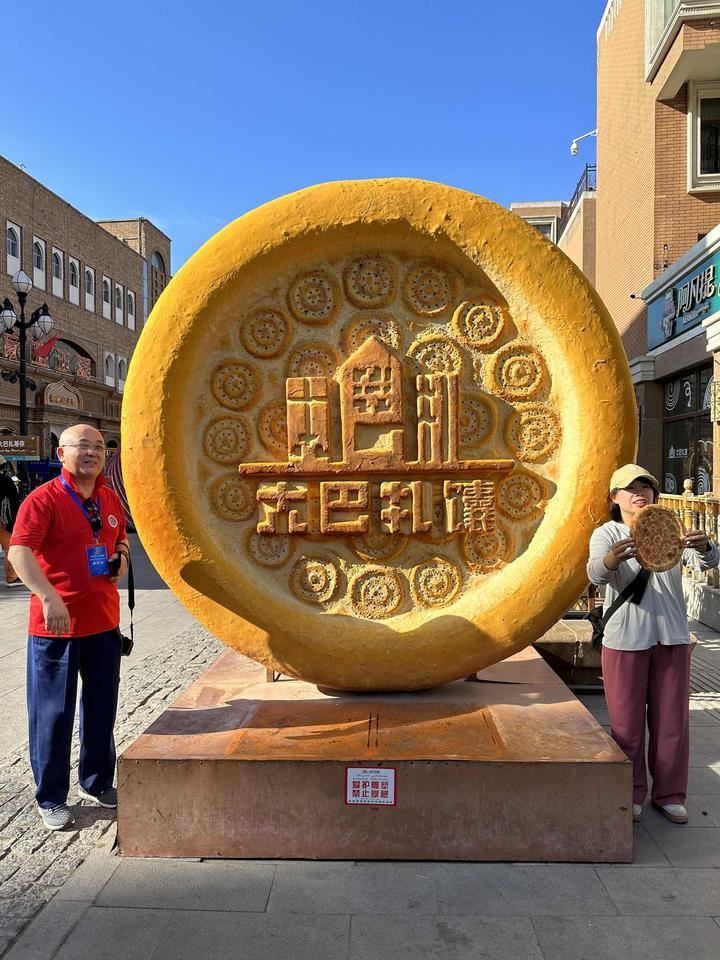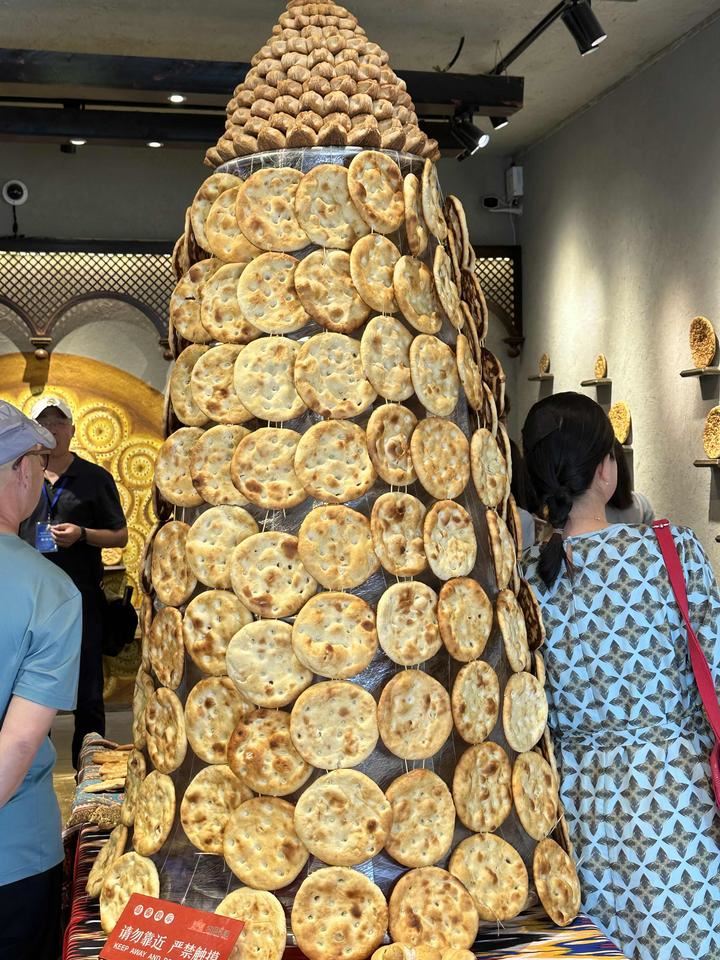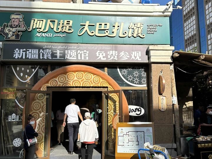 新疆人做馕,既不叫“揉”,也不叫“擀”,而叫“打”——打馕,一个“打”字形象地刻画了做馕的过程。在维吾尔族农户家,会常见到这种馕坑,这种大小的馕坑可供一家四五口人使用,除了烤馕之外,馕坑还可以烤包子、烤羊排、烤全羊、烤鸡等。 出馕房右手,有为游客定制的景观馕坑,高四米,游客可以进入馕坑中参观感受馕坑的制作工艺。此外,这也是步行街最红网红打卡点之一,网红标语“游大美新疆,品大巴扎馕”。