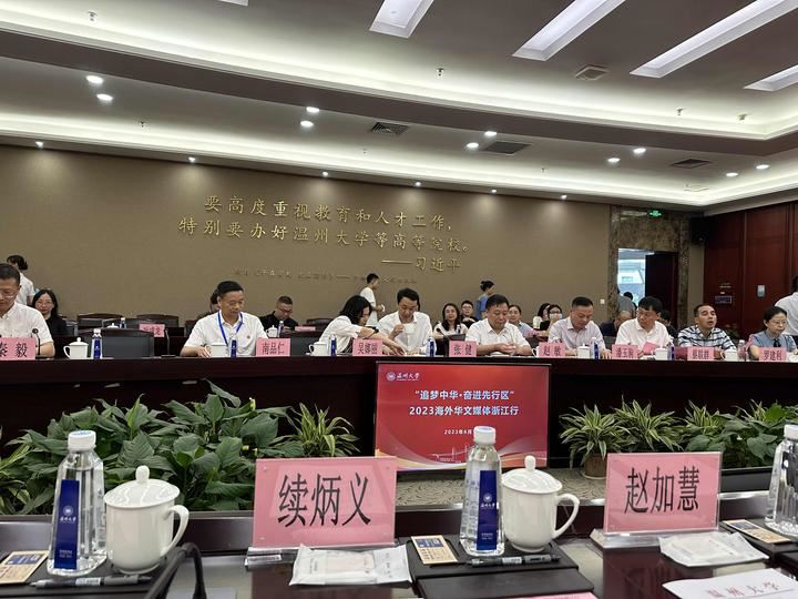 (国际华文媒体联盟记者、马来西亚海内外传媒集团记者、海内外杂志社记者联合报道)6月15日,来自马来西亚、澳大利亚、美国、德国、加拿大、埃及、英国、马达加斯加、菲律宾、尼日利亚、日本、中国香港、中国澳门等国家和地区的19家华文媒体代表,以及中央广播电视总台、光明日报、人民政协报、人民网和浙江侨音融媒体中心的记者在中国侨联信息传播部宣传处副处长曹晓婧等领导的带领下走进温州 参加由中国侨联指导,浙江省侨联和温州市侨联主办的“追梦中华·奋进先行区”2023海外华文媒体浙江采访行时来到温州大学参访,温州大学举行欢迎式,党委书记张健、校长赵敏等领导出席并陪同参访。浙江省侨联文化交流部部长、温州市侨联党组书记吴娜丽、市侨联主席南品仁等领导陪同参访。