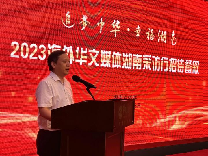 在启动仪式上,孙民生书记首先致辞,他说,在骄阳似火的七月,我们相聚在湘水之滨、大美湖南,共同开启“追梦中华·幸福湖南”2023海外华文媒体湖南采访行活动。首先,我谨代表湖南省侨联,向各位海外华文媒体与记者朋友们表示热烈欢迎!湖南地处“沿海的腹地、内陆的前沿”,历史悠久、人文厚重、山河壮丽、产业发达,是中国最具地域特色和文化底蕴的省份之一,以红色热土、伟人故里享誉世界。湖南是中国共产党和中国革命的重要策源地。2020年习近平总书记在湖南视察时曾深情地说,湖南十步之内必有芳草。毛泽东、刘少奇、任弼时、彭德怀等无产阶级革命家,为创建中国共产党、缔造中华人民共和国做出了卓越贡献;新中国首批授衔的10大元帅中有3位是湖南人,10位大将中有6位是湖南人,57名上将中湘籍19人,17位中将中湖南有45人,故湖南有“伟人故里”“将帅之乡”“革命圣地”“红色摇篮”之称。湖南是一本锦绣美丽的画卷。这里山川秀丽,古迹众多,旅游资源丰富。历史文化名城长沙及其岳麓书院、岳阳洞庭湖和岳阳楼、南岳衡山、常德桃花源、韶山毛泽东故居、郴州东江湖等久负盛名。张家界市武陵源风景名胜区,堪称世界天然大奇观,融峰林独特的造型美和大自然原始野趣于一体,可谓“峰迷全世界”。湘西的民族风情浓郁,矮寨、十八洞、德夯大峡谷景区成功创建5A级景区,凤凰古城、老司城、里耶古城等景区享誉国内外。尤其是第二届湖南省旅发大会将于9月16日在郴州召开,届时将向全世界展示一个更加迷人的湖南。湖南更是一片奋发向上的发展沃土。近年来,全省上下深入贯彻落实习近平总书记对湖南重要讲话重要指示精神,努力把习近平总书记为湖南擘画的“三高四新”美好蓝图变为美好现实,在奋力推进中国式现代化新湖南建设的实践中“湘”当有为。2022年,湖南国内生产总值突破4.8万亿、排全国第9位,2023年上半季度增长4.3%,规模工业、投资、消费增速均高于全国平均水平。在湘世界500强达187家,高新技术企业突破万家,超级计算机、超高产杂交稻、超高速列车和深海、深地、深空等领域创新成果领先世界。全球每下线10台混凝土机械就有8台产自湖南,中国每生产10台中小型航空发动机就有9台产自湖南,工程机械行业全球前50强湖南占有4家、全国前5强占有3家。在湘“两院”院士44人,湘籍院士131人、排全国前列,“双一流”高校5所、居全国第8位。