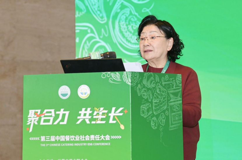 中国商业联合会原副会长、全国酒家酒店等级评定委员会主任张丽君在致辞中充分肯定世界中餐业联合会连续三年在行业内系统推进ESG相关工作,通过征集和宣讲优秀案例、发布行业倡议与实践报告、宣贯核心指标体系,以及今天即将发布的ESG实践十大关键词等一系列务实举措,有效地提升了全行业的社会责任认知与意识,这些工作有力地引导了企业追求与社会、环境的和谐共生,为餐饮产业的高质量发展注入了新的理念动力。她指出,中国餐饮业践行ESG理念,具有多维度和战略性的重要意义,体现在绿色发展、民生服务、文化传承、行业协同等多个方面。根据党中央对“十五五”规划建议精神,绿色低碳、可持续发展已不再是企业的“加分项”或“可选项”,而是决定企业未来生存空间与发展质量的“必选项”和“得分项”。必须将ESG从理念倡导全面转向深度融入运营管理的实际行动。一是发挥标杆引领,推动全面参与,找准切入点,因地制宜地履行社会责任,形成企业协同共进的责任共同体。二是鼓励模式创新,探索特色路径,探索公益项目与商业模式的有机结合,让社会责任实践创造共享价值,更具生命力和可持续性。三是构建协同生态,凝聚各方合力,共建一个政府引导、协会推动、企业主体、社会参与的责任餐饮生态圈。
