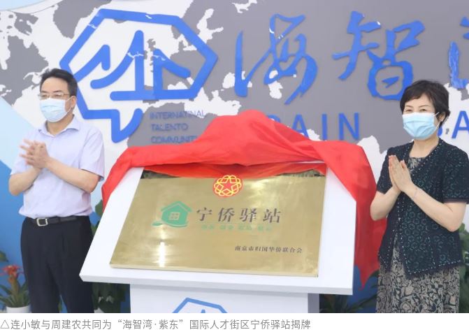 调研期间,连小敏出席“海智湾·紫东”国际人才街区宁侨驿站成立仪式,并与周建农共同为宁侨驿站揭牌。