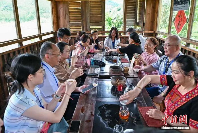 8月28日,“追梦中华·扬帆自贸港”2025海外华文媒体海南采访行走进五指山茶园,在雨林环抱中闻香品茗,领略五指山红茶的魅力。中新网记者 骆云飞 摄