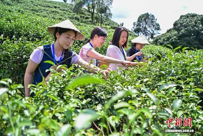 8月28日,在五指山水满乡,海外华媒人士体验茶青采摘。中新网记者 骆云飞 摄