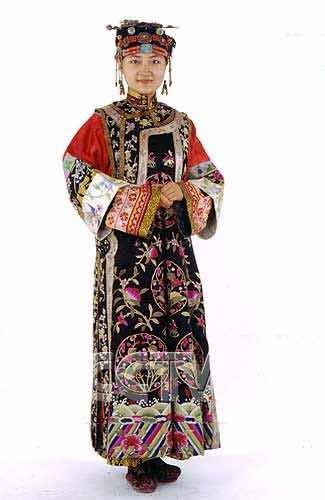 土尔扈特蒙古服饰:此蒙古部康熙年始居住于内蒙古草原西部。妇女服饰风格独特,女袍领口下为小对襟,右拐直角,并在右裉系扣,腰部有刺绣和抽褶等装饰。