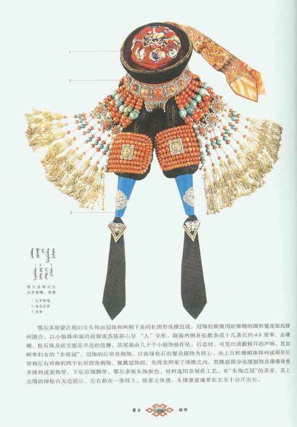 科尔沁蒙古服饰:此蒙古部因居住地与满族毗邻,其装饰风格深受满文化影响,头饰为珊瑚珠串头围带插各式簪钗,袍服制作亦吸收满式风格,并注重绣花、贴花、盘花等工艺运用。