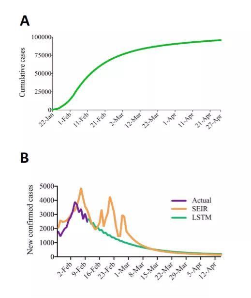 ▲(A)LSTM预测的全国COVID-19病例累计数量,(B)根据实际数据(紫色)、SEIR模型(橙色)和LSTM模型(绿色)计算的COVID-19新增病例数。