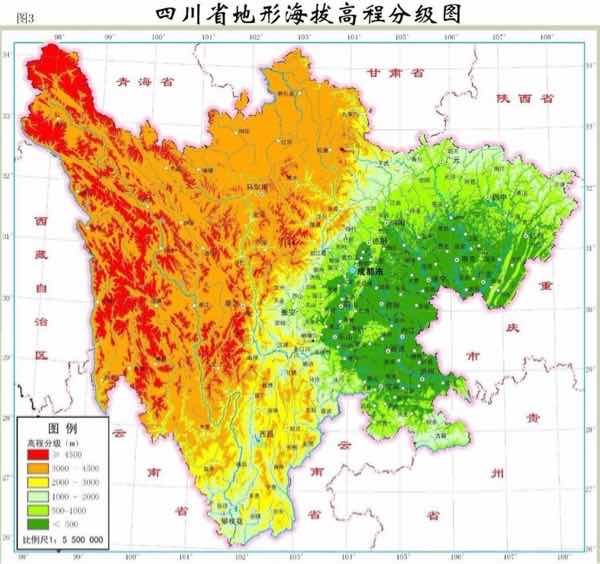 四川位于中国大陆地势三大阶梯中的第一级和第二级,即处于第一级青藏高原和第三级长江中下游平原的过渡带,高低悬殊,西高东低的特点特别明显。西部为高原、山地,海拔多在3000米以上;东部为盆地、丘陵,海拔多在500~2000米之间。全省可分为四川盆地、川西高山高原区、川西北丘状高原山地区、川西南山地区、米仓山大巴山中山区五大部分。