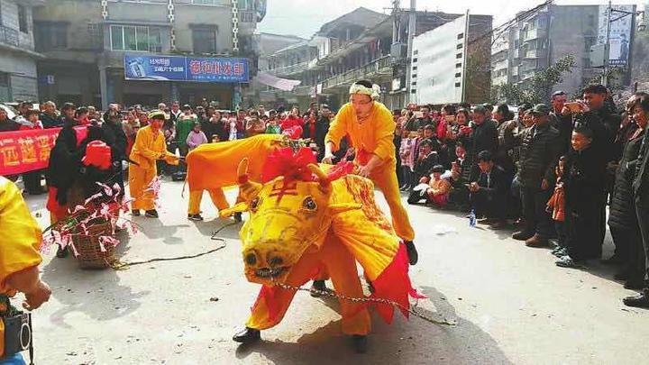 越溪牛灯舞:牛灯舞盛行于越溪。一人扮牧童,二人顶戴牛型道具扮牛。牧童在锣鼓声中先面向观众说顺口溜,表示节日祝贺,然后牵牛出场舞蹈。主要是摹拟日常喂牛、用牛、与牛嬉戏等舞姿。最受欢迎的是,“牛”发“吼”,不听使唤,狂奔乱跳,急得牧童抓脑搔腮、窘态万状。逗得观众大乐。由于牛可耕田、驮运,与民众生产、生活关系密切,故此舞蹈使人感到亲切可爱。